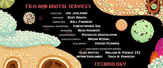 Each land had a unique look with artwork that ranged from straight, diagonal to curvy lines and text to match. Unique to Wreck-It Ralph was the creation of a new 8-bit font, designed by our Film & Digital Services’ Title / Graphics team. After experimenting with several different fonts, the Title Graphics team designed an entire alphabet to match the style of the movie that was not only used in the end credits but also in several of the inserts for Wreck-It Ralph. (The section headers in this article were made using this âWRECK-IT RALPHâ font.) Matching the End Crawl to the artwork in the film and the design of the custom âWRECK-IT RALPHâ was an artistic process and a collaboration between the DDSS Film & Digital Services team and the Feature Animation production crew.
